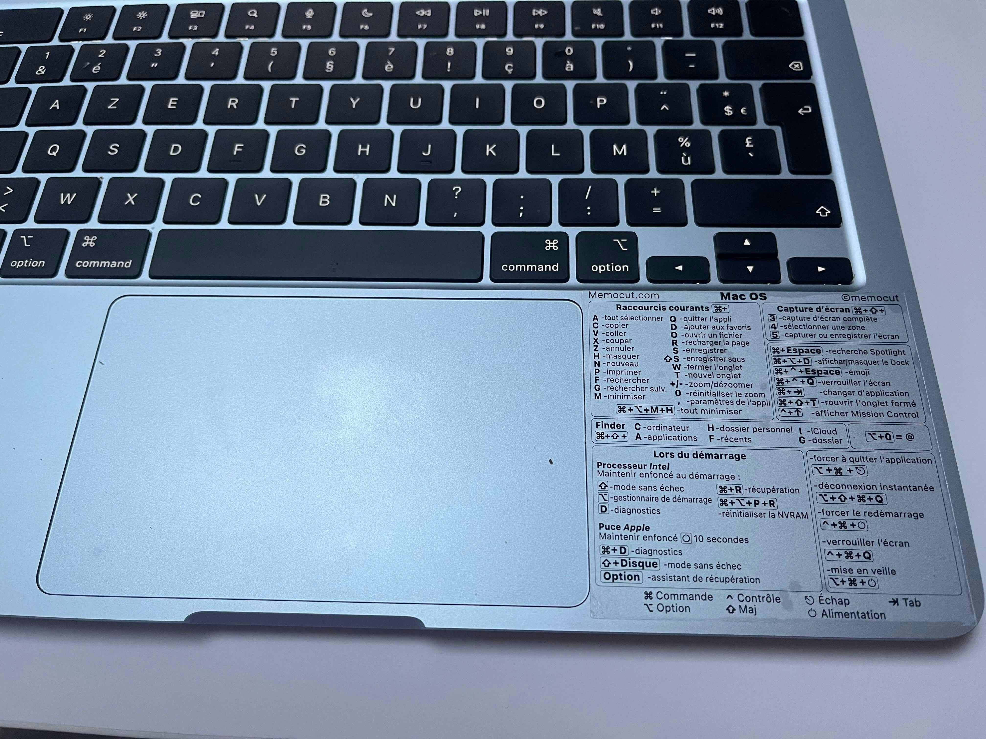 Cet autocollant est super pratique car il nous permet d’avoir les principaux raccourcis devant les yeux. On ne doit plus les chercher sur internet au moment fatidique !… 👍